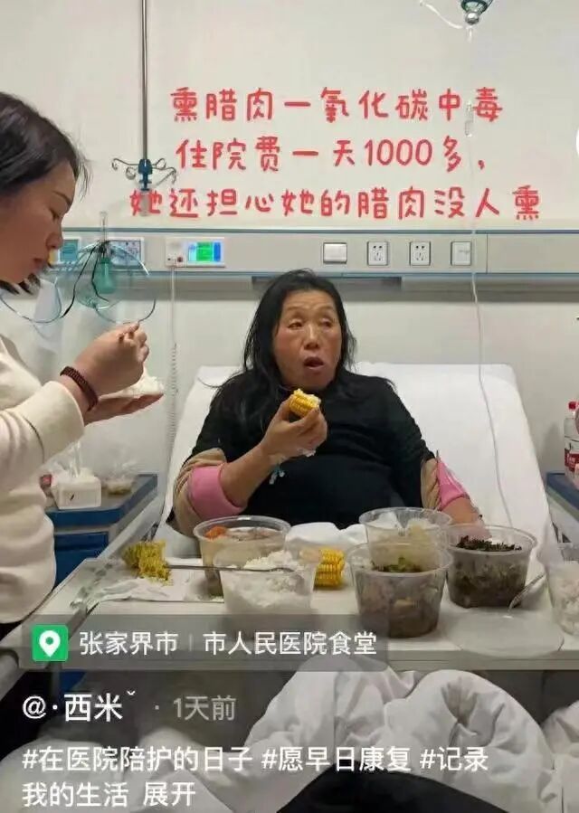 老太太自己在家熏肉给自己弄一氧化碳中毒了,连夜送到医院,花了好几千,输液的时候还念念不忘家里的熏肉。