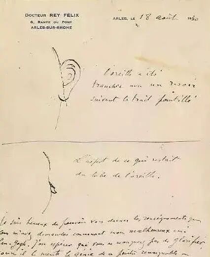 在加州档案馆里,有一张小小的纸片,画着一张清晰梵高耳朵的素描,梵高几乎是一整只左耳被割下,脸颊边缘只有一小块耳垂残留。
