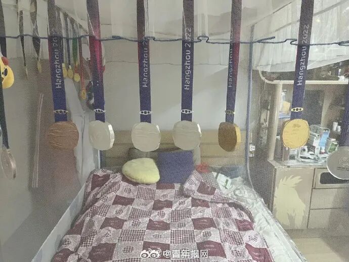 潘展乐更是训练狂魔,住在酒店,还在床上一遍遍重复游泳的动作,为了激励自己,蚊帐上挂满了奖牌,据说,还特意把C位留给了奥运金牌。