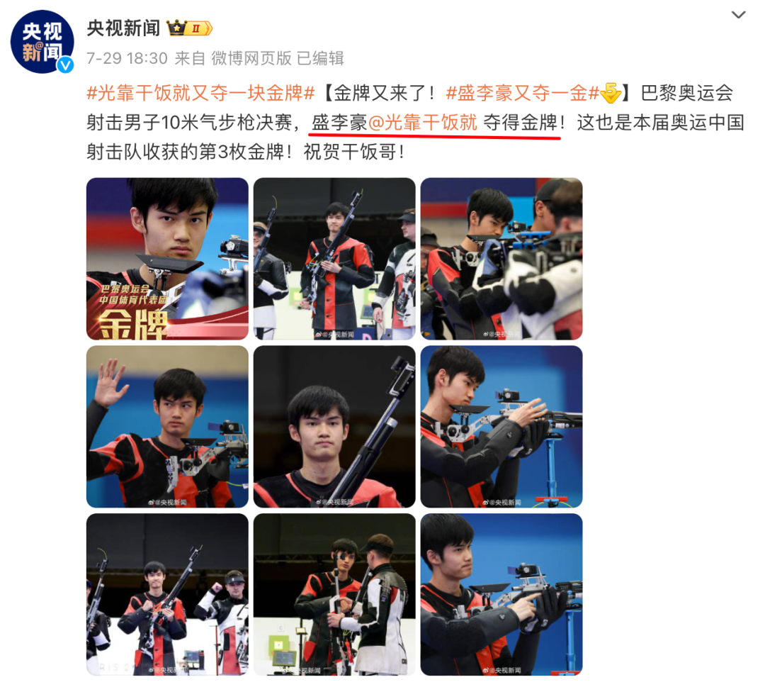 赛场上,盛李豪是面无表情,冷峻沉静的射击「杀手」。赛场后,靠着抽象的微博名「光靠干饭就」,化身为干饭哥。
