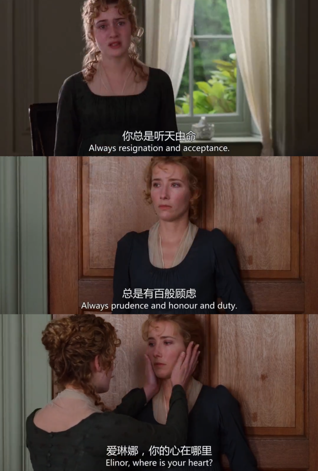 作为对比,姐姐埃丽诺不仅显得头脑冷静,她对妹妹巨大的爱,总能让她做出最恰当的抉择。