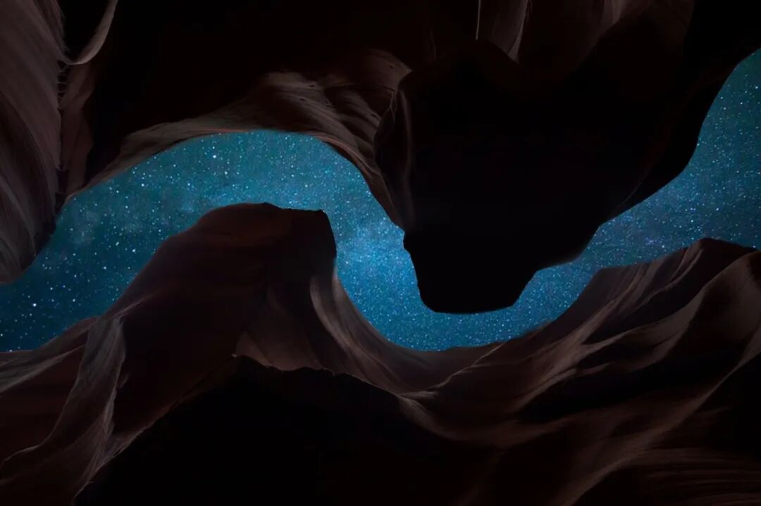 秋⽇晴朗的夜空下,⼭峦泛出蓝⾊的幽光,⽽河流泛出的是乳⾊的幽光。