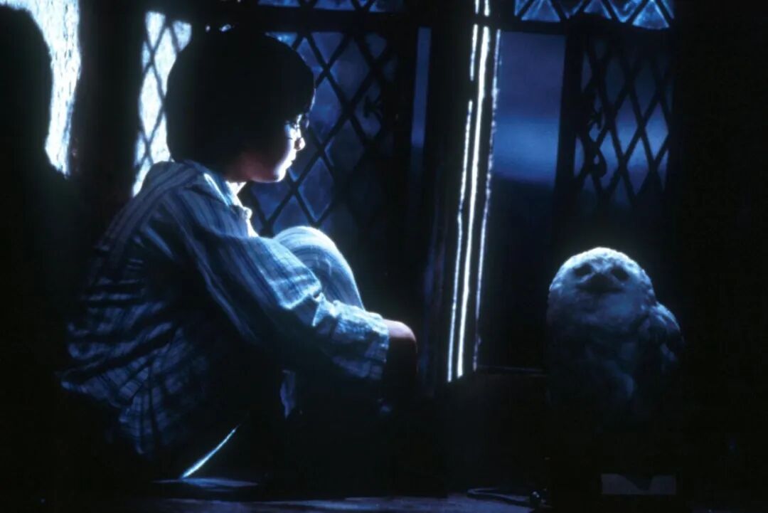 电影中有一幕,很让人很动容,哈利身穿单薄的格子睡衣,深夜一个人坐在冰冷的落地窗前,望着玻璃的倒影,想念着他的父母,他们也曾经是这所魔法学校的学生。