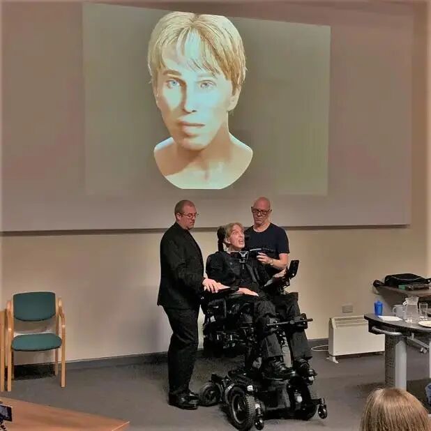 他用全身上下只有眼睛和面部的几块肌肉移动,通过眼动追踪设备和人工智能软件把想法转化为文字,又合成自己的语音,和别人交流。