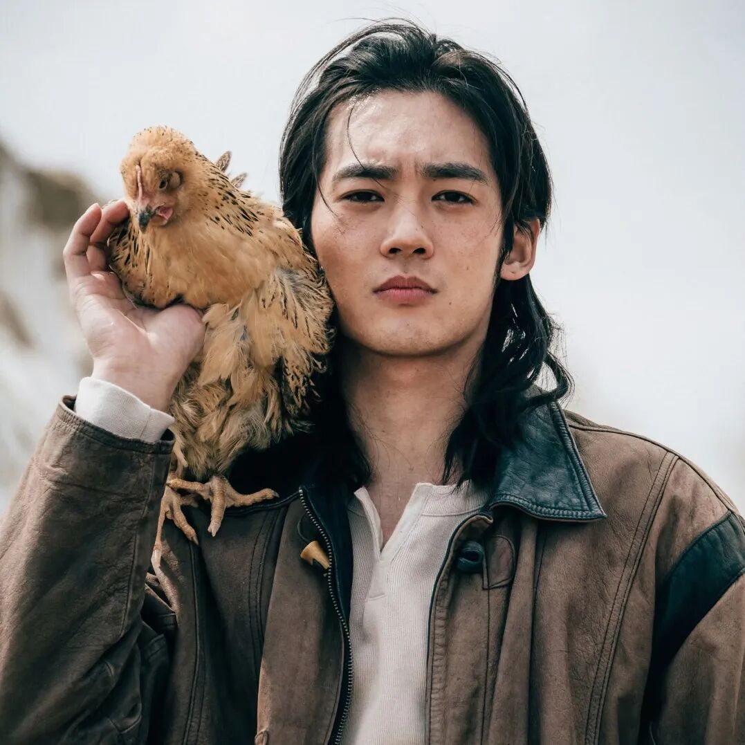 拍戏喊卡间隙,他搂起现场的一只鸡,暖心地偎在怀里,哄它睡觉。在于适的“驯服下”,一人一鸡熟络了起来。