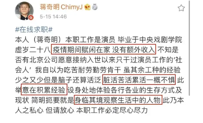 在家里实在呆不下去了,他在微博上登了一则工作广告。