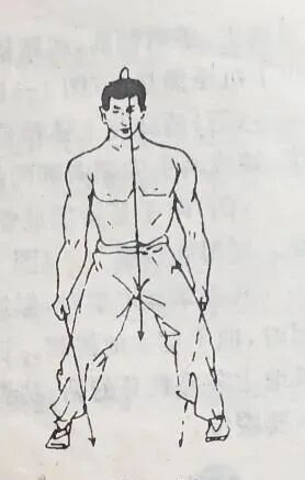 双足分开,与肩同宽或比肩略宽,脚尖向前,平行站立或外八字,身体重心放于两足之间,前后重心置于脚掌与脚跟之间,脚心要空。