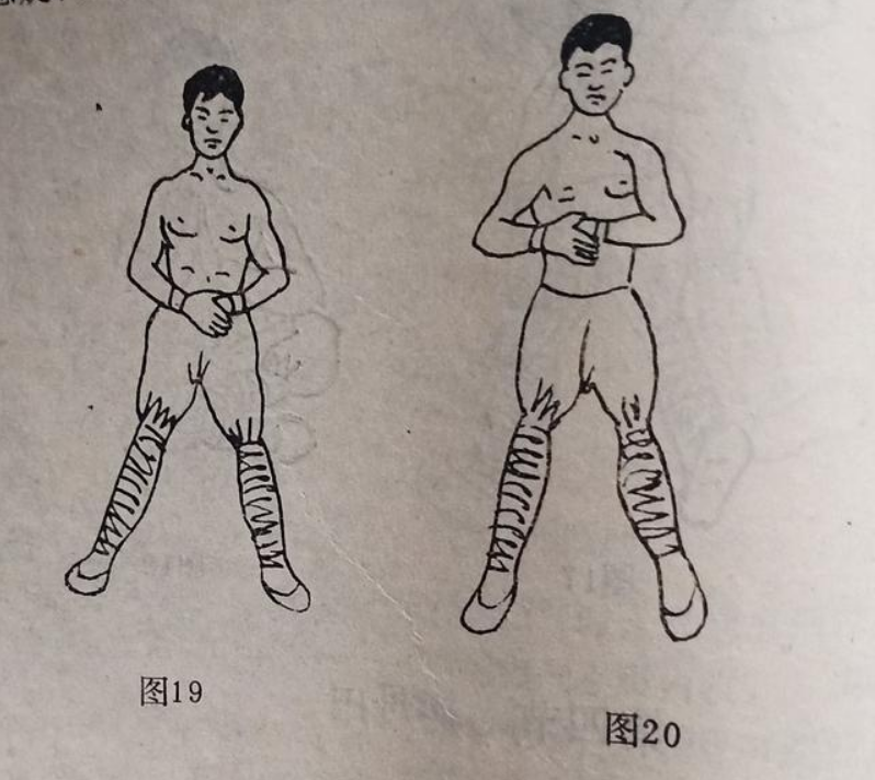 一.两脚自然站立与肩同宽,全身放松,口眼微闭,舌轻舐上聘,左手掌心紧贴于下丹田处,右手掌轻贴于左手掌背,意守丹田(图19)。
