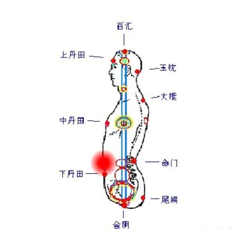 运行路线:下丹田-会阴-尾闾-命门-夹脊 - 大椎-玉枕-百汇-上丹田-鹊桥-重楼-中丹田-下丹田