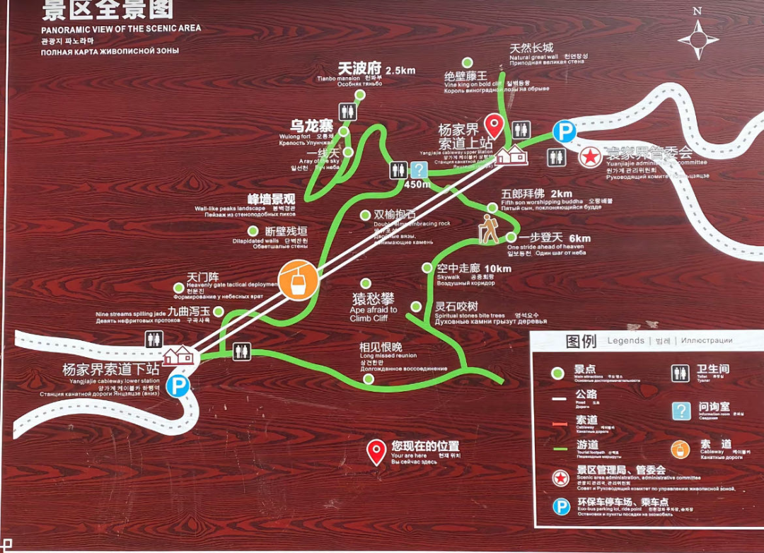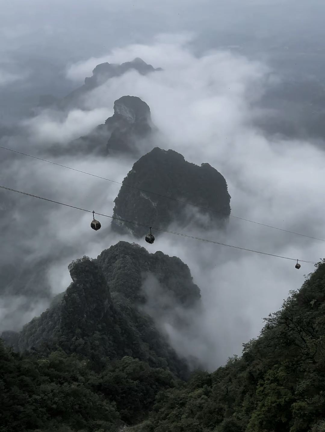 天子山索道:购买索道票72元,坐索道到达山下,索道挺长,可以从上到下看乾坤柱和各个山的横截面,体验不错。从索道下来可以坐环保车直接回东门,也可以去十里画廊看看。