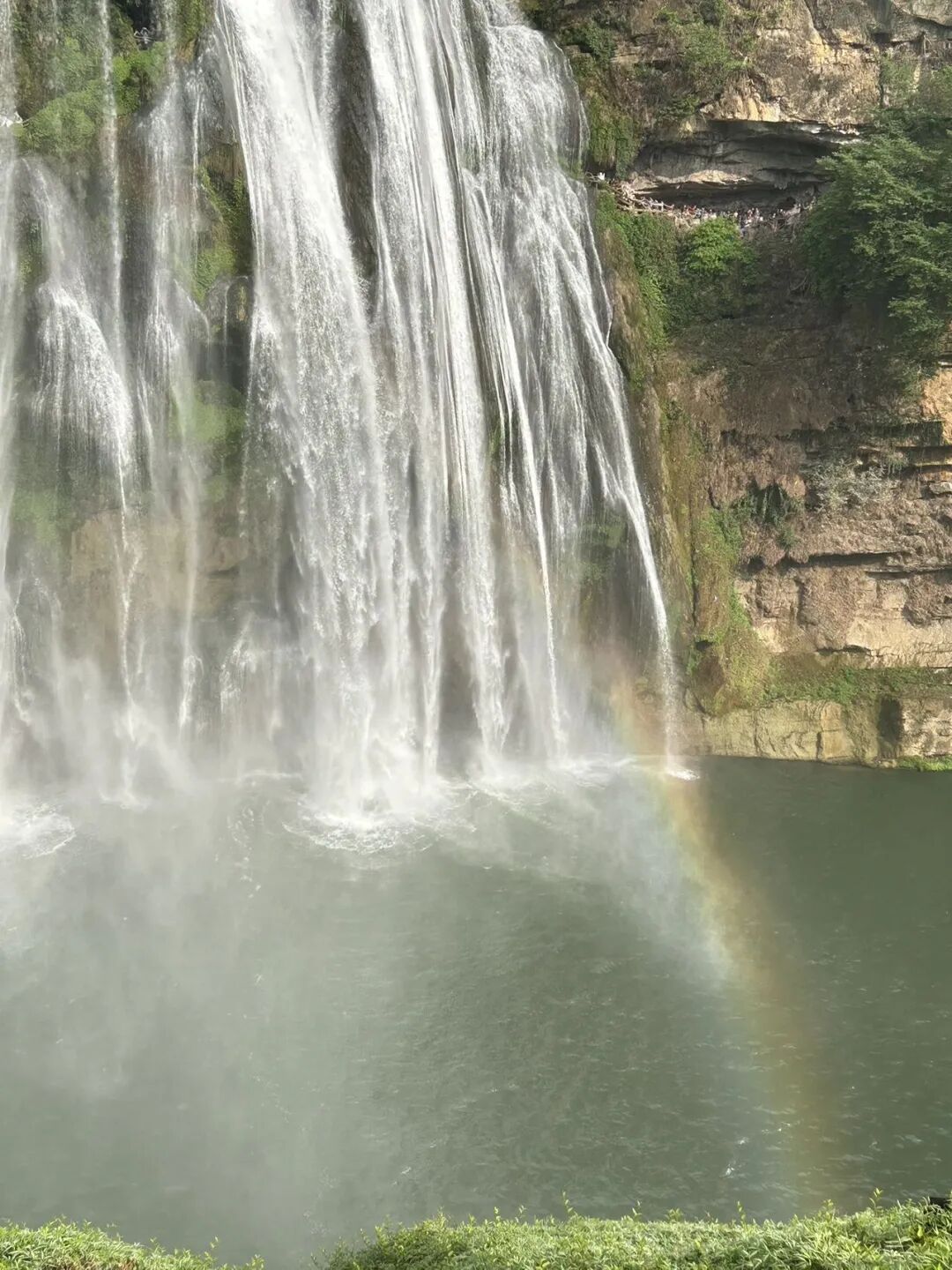 在晴天,阳光照射在瀑布低端,瀑布流下来的水雾弥漫四周会形成靓丽的彩虹,流下来的水雾会轻轻飘在脸上。