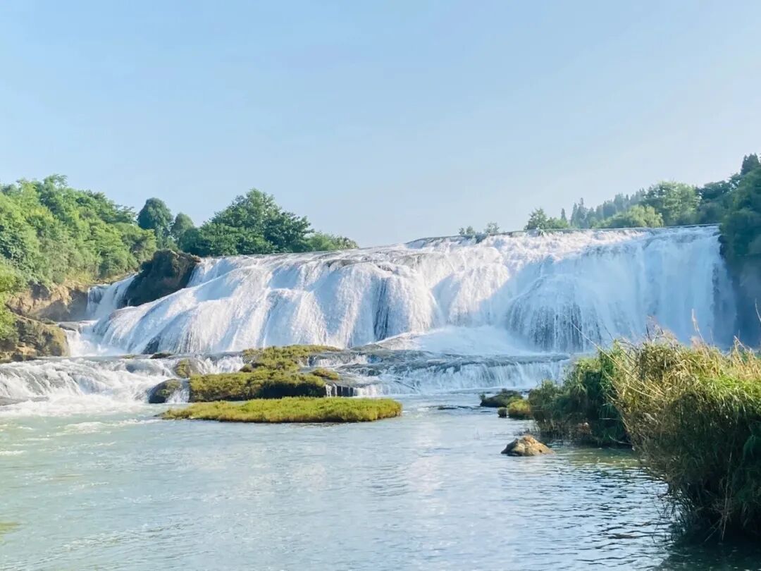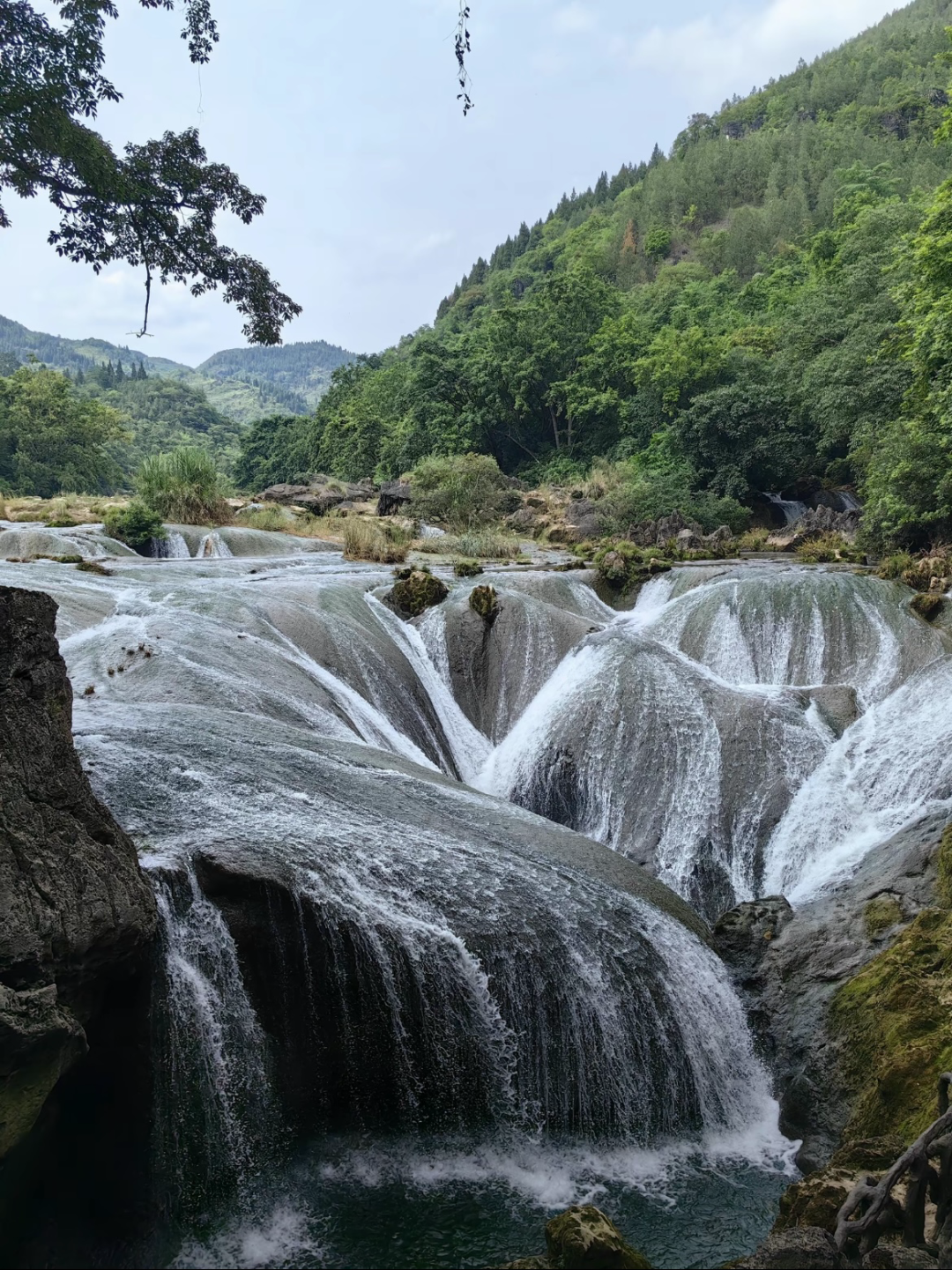瀑布水流清澈,沿高低起伏的坡面,水流均匀散开,宛如素绵绢扇般银光泛泛。
