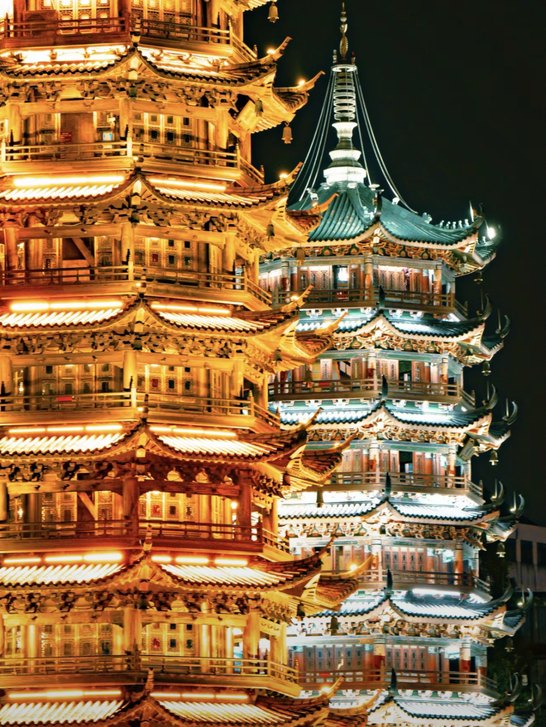 日月双塔在夜间会展现出美丽的金银双色,是游客争相拍摄的景点。