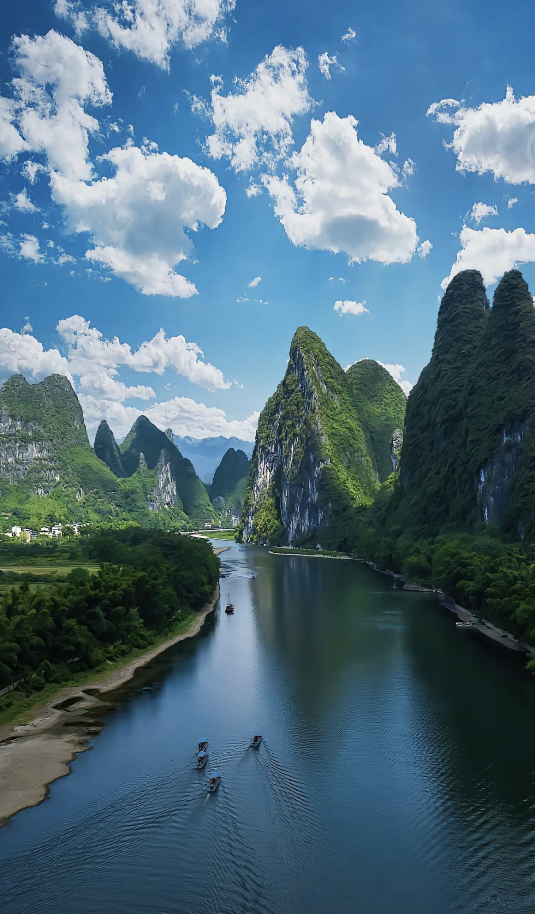 喀斯特地貌:阳朔地区广泛分布着喀斯特地貌,形成了许多壮观的石灰岩山峰和溶洞。这些山峰形态各异,有的如竹笋般挺拔,有的则如屏风般连绵不断。