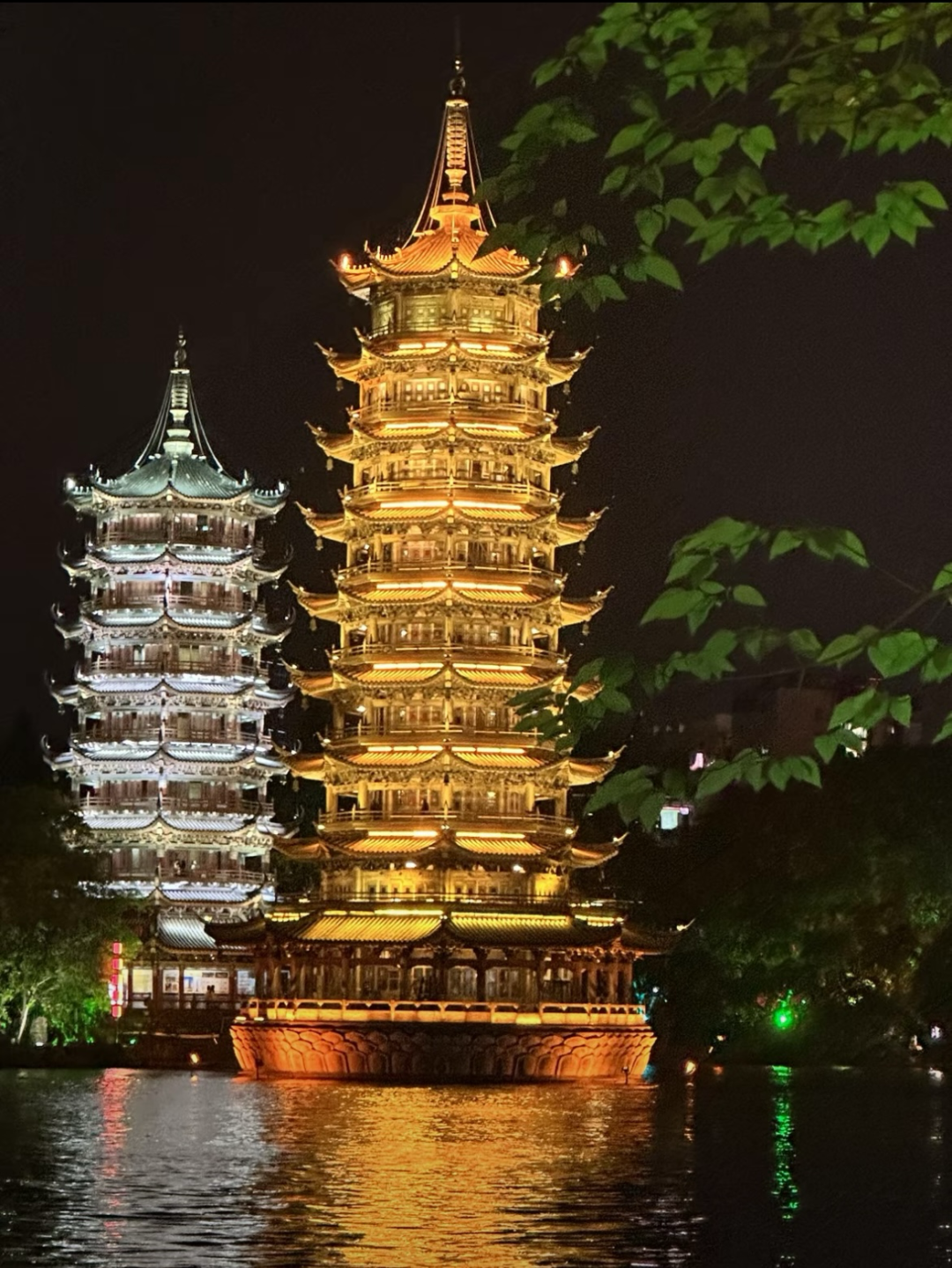 广西日月塔,也称为金塔银塔或情侣塔,位于广西壮族自治区桂林市的杉湖中,是桂林市的标志性建筑之一。