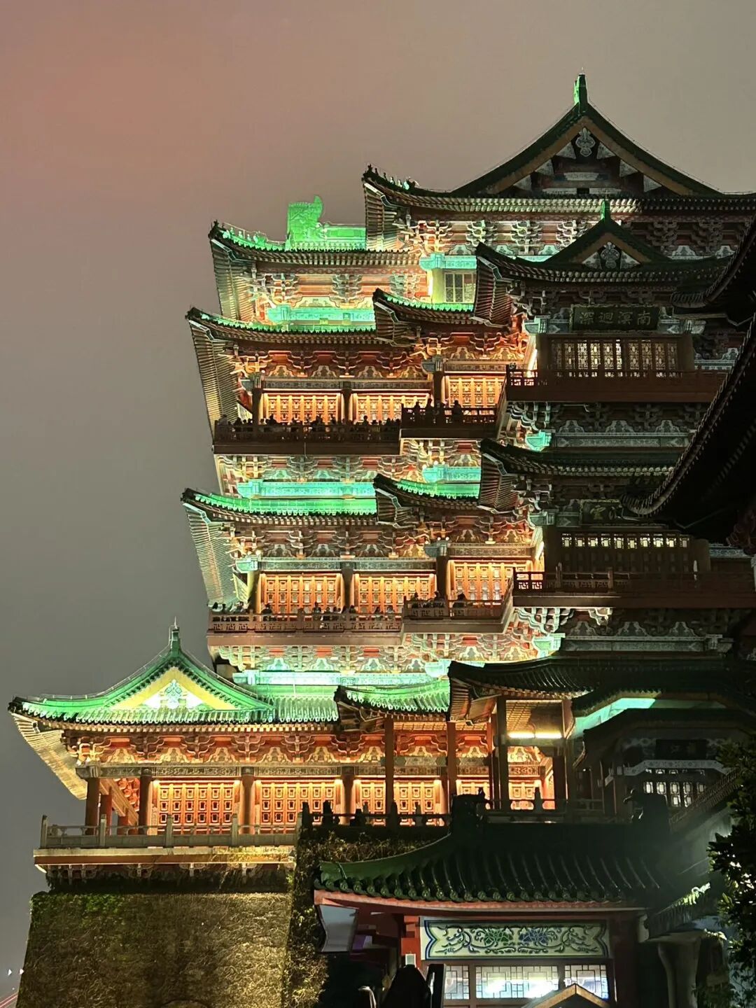 特色:大殿巍峨庄重,在灯火光晕的勾勒下显得更加古朴恢宏。高大的门楣书有“铁柱宫”三字,往下依次可见景德观、延真观、铁柱延真之宫等名号,均为历代皇帝御封。
