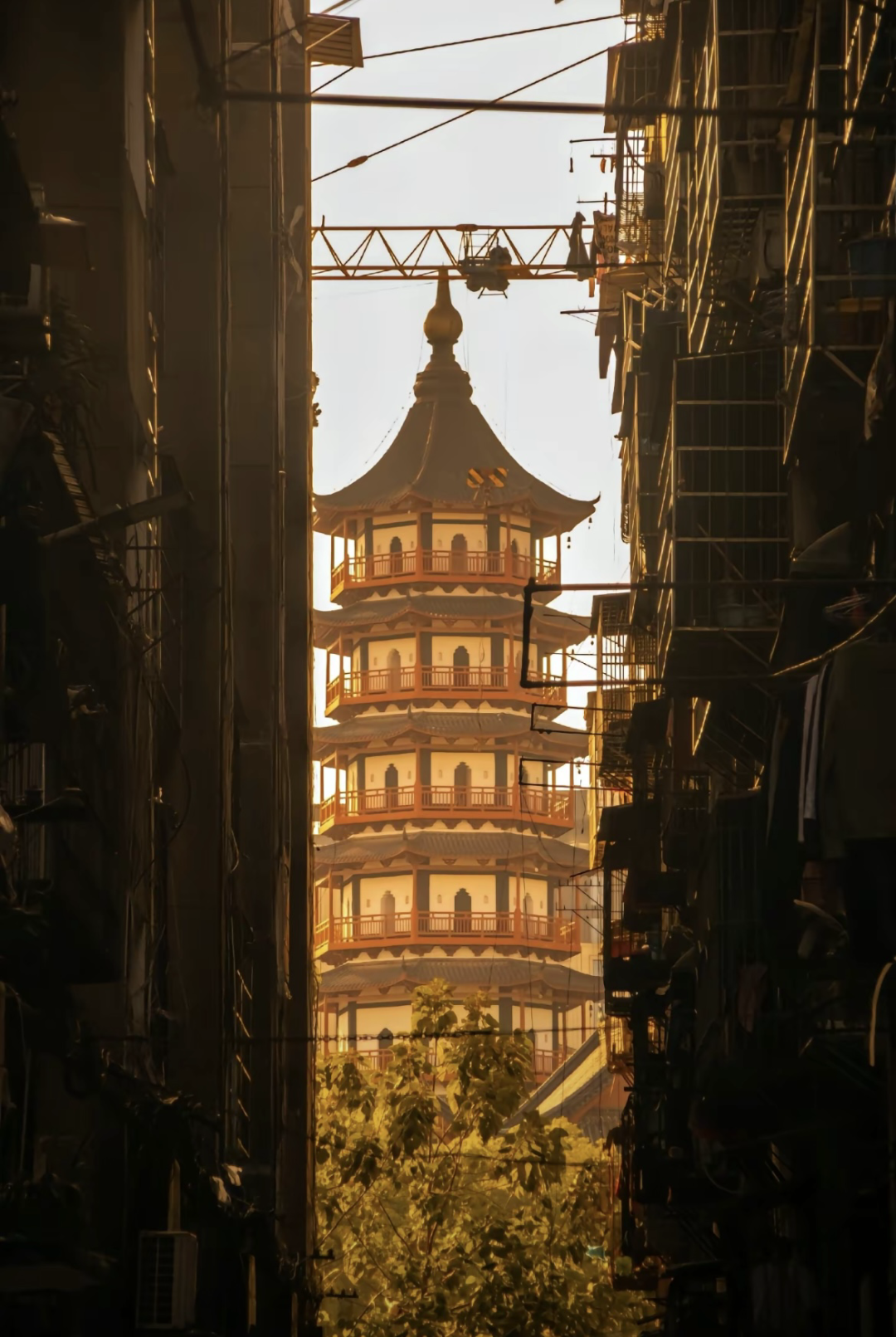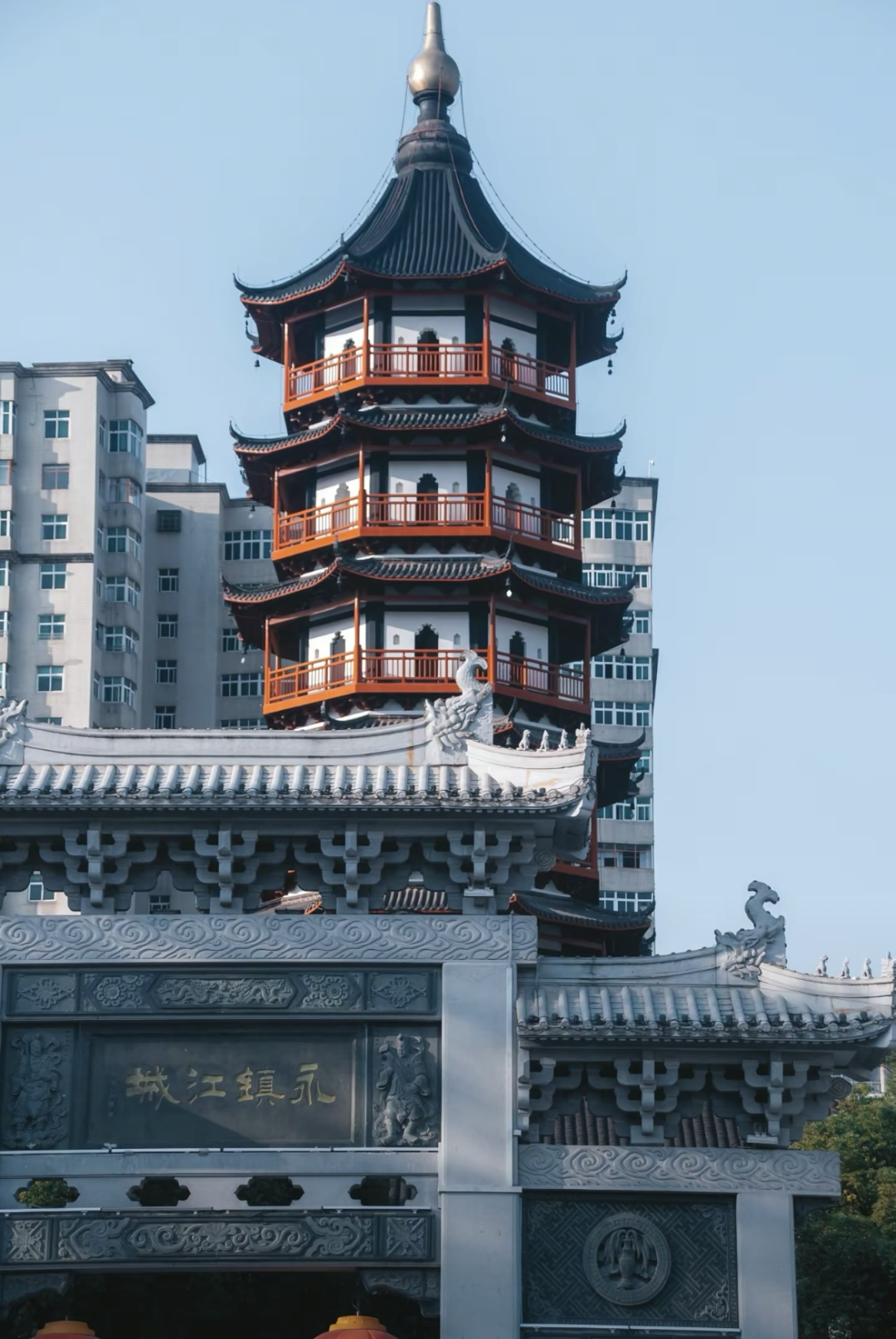 朱栏青瓦,墨角净墙及鉴金葫芦型顶,飘逸的飞檐并悬挂铜铃