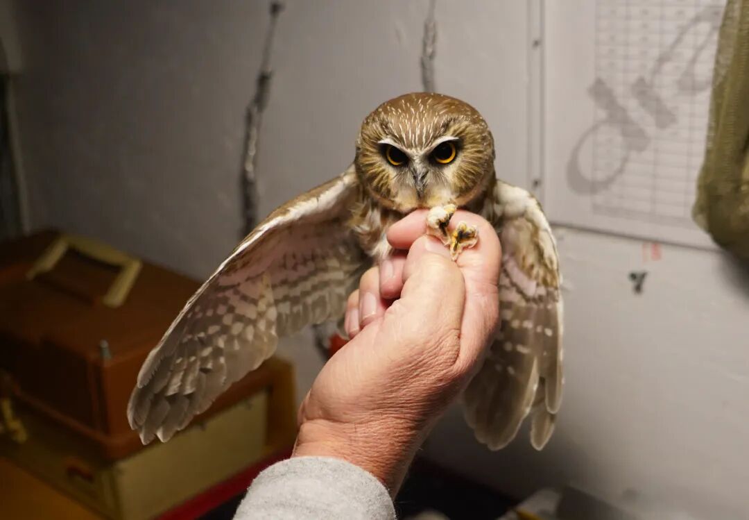这是这只猫头鹰在能够检测到紫外线的设备下的颜色,它会发出荧光,鸟类可以看到这样的荧光,只是它肯定不是我们现在感知到的这样。