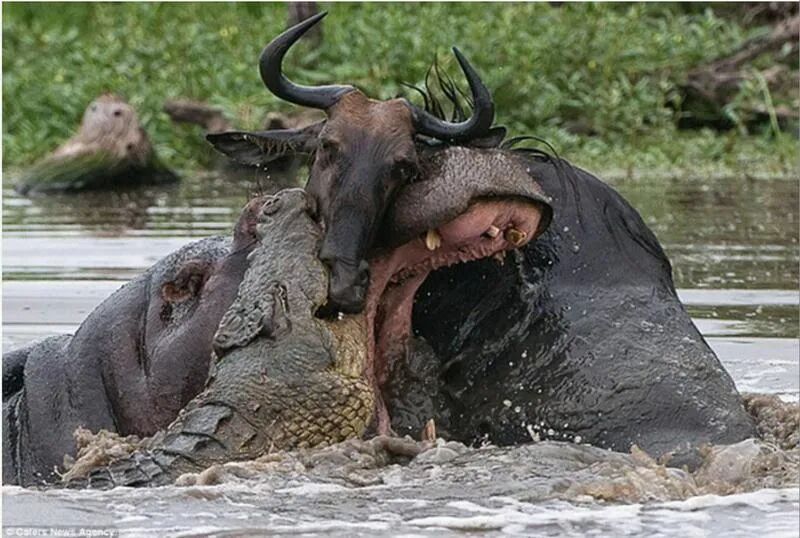 一匹非洲角马在水坑边上被鳄鱼咬住一只脚,无法挣脱,它的同类全部在一边视若无睹,没有提供任何帮助,而就在它快被拖入水中的时候,两只河马过来驱赶了鳄鱼,角马获救。