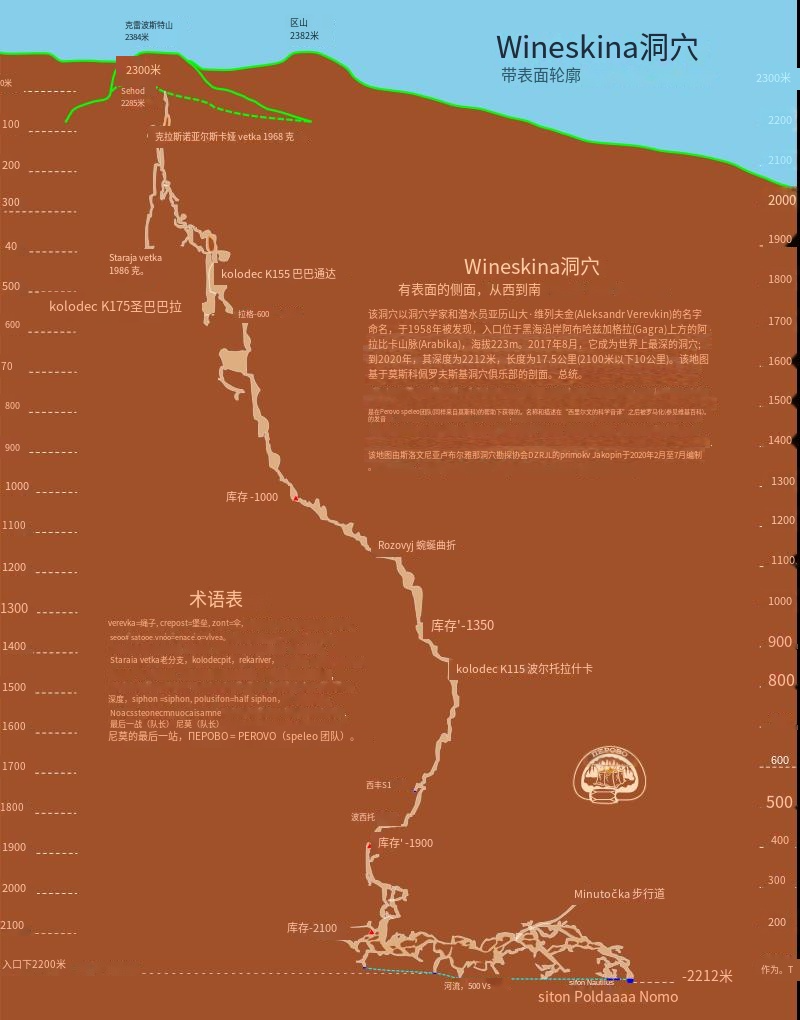 这是(下图)目前世界最深洞穴的横截面,它被称为韦廖夫金洞穴,位于格鲁吉亚阿布哈兹地区,已探索的部分达到2212米。