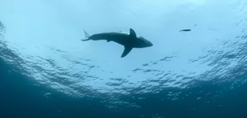 它将鲨鱼赶到水面,并缓慢地靠近鲨鱼。
