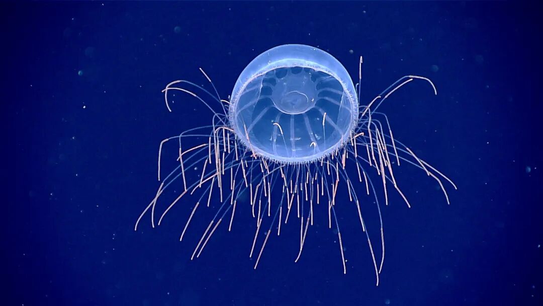 你现在看到的这个是一种罕见的深海水母,它叫Halitrephes maasi,相当漂亮。