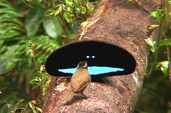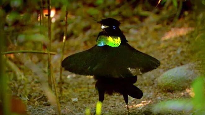 雄性展示鲜艳羽毛争夺交配权,在鸟类中是非常普遍,所以有理由相信极乐鸟确实是在用黑来突出胸前的彩色羽毛。