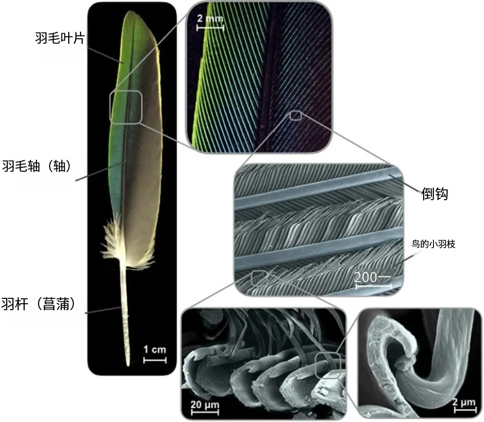 上图便是这种羽毛放大细节后的样子,它的每根羽小枝上都布满了弯曲的更小结构。