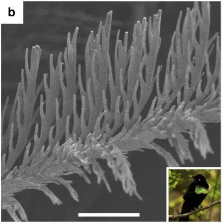 当光照射在极乐鸟超黑羽毛上时,光子会进入羽小枝上那些弯曲密集的结构中,无法逃脱,只会在内部不停反弹并以减少能量,直到完全消失。