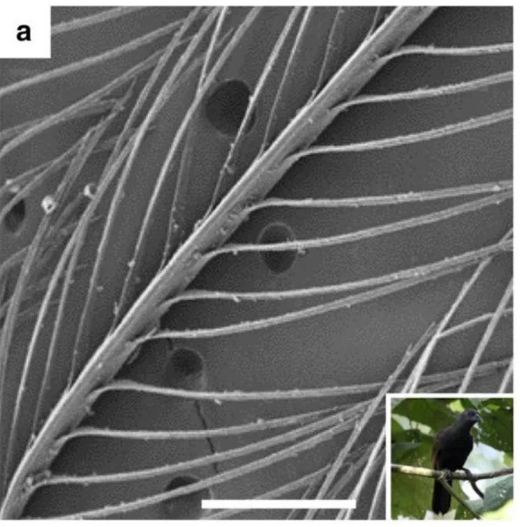 放大这些羽毛,你会发现它的结构有别于普通黑色羽毛。