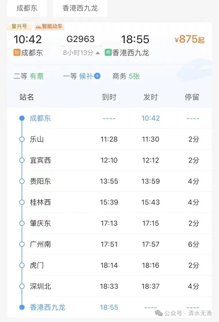 从四川成都出发到香港,上午10点42从成都东站出发,经停乐山、宜宾西、贵阳东、桂林西、肇庆东、广州南、虎门、经深圳北抵达香港西九龙站,历时8小时13分!