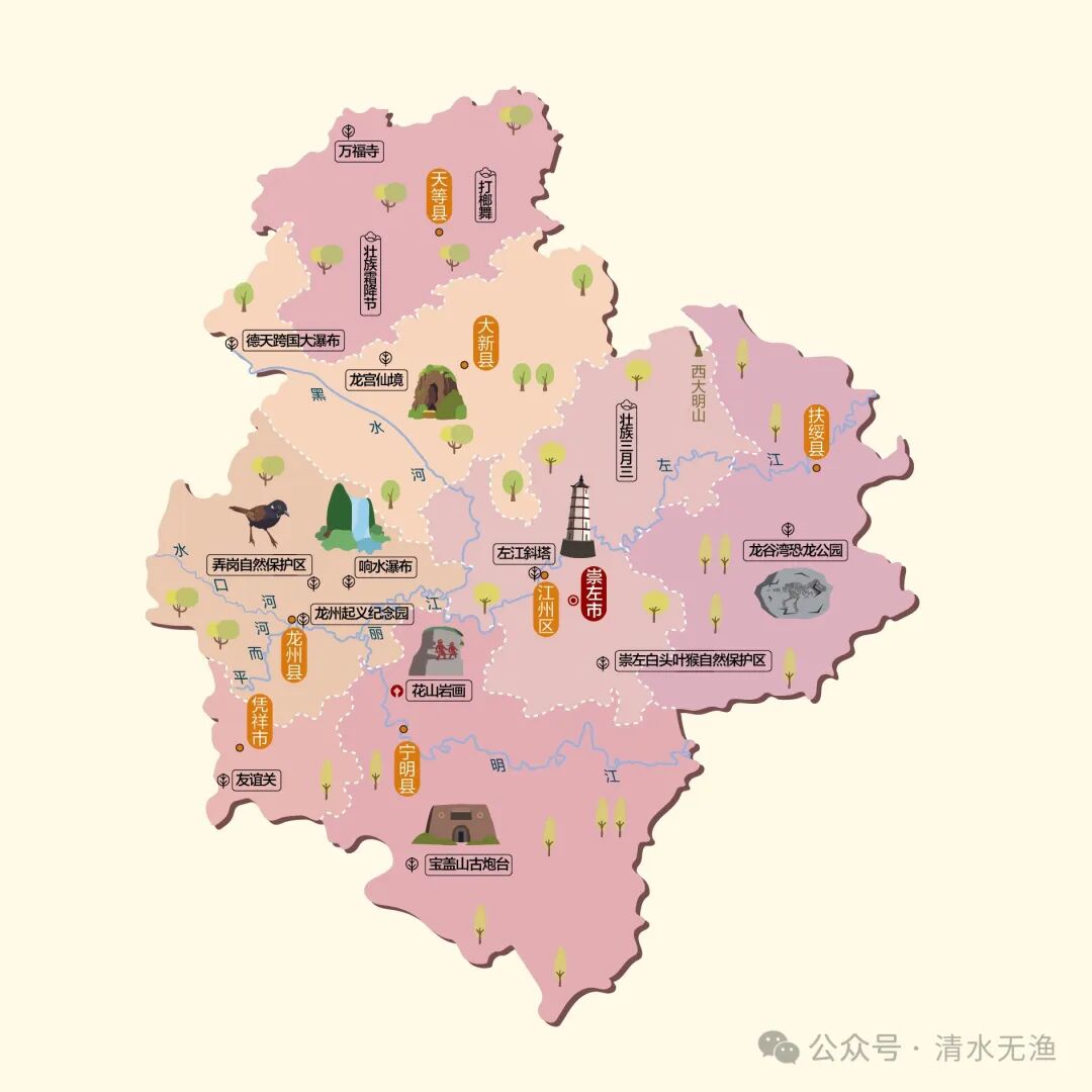 崇左市辖一个市辖区和5个县,代管一个县级市,分别是江州区、扶绥县、大新县、龙州县、宁明县、天等县、凭祥市。