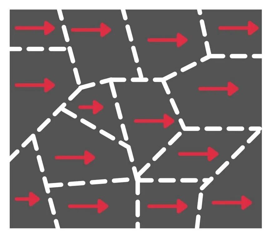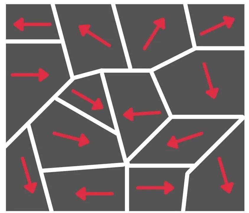 由于这种量子效应只能使原子磁场的方向“大致相同”,因此如果铁原子的数量太多,它们就只能形成一小块一小块的“原子磁场方向基本一致”的区域,这种区域就被称为“磁畴”(Magnetic Domain)。