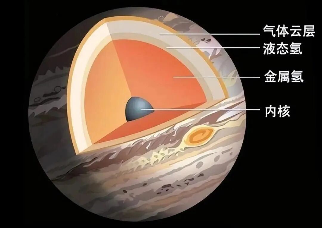 “金属氢”的外侧依然不是气体物质,因为这里压力依然很大,以至于氢和氦只能以液体的形式存在(注:氢和氦是木星的主要构成物质,其中氢比氦更多),只有在这层液体物质之外,才是由气体物质构成的大气层,其厚度至少有5000公里。