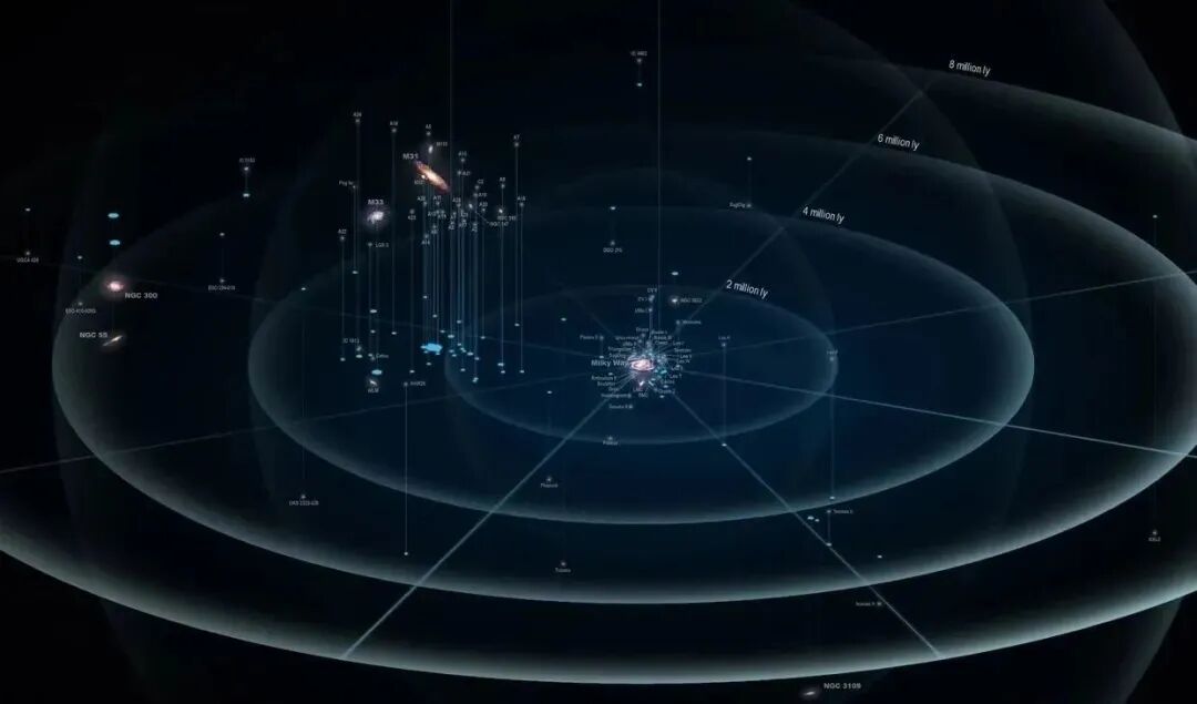 “本星系群”是一个跨度约为1千万光年的结构,包含了大约50个星系和矮星系,其中仙女座星系是最大的,银河系则排名第二,由于这两个星系占据了“本星系群”的大部分质量,因此整个“本星系群”的共同质心其实是位于仙女座星系和银河系之间,而那里几乎是一片虚无,除了极为稀薄的星际物质之外,什么都没有。