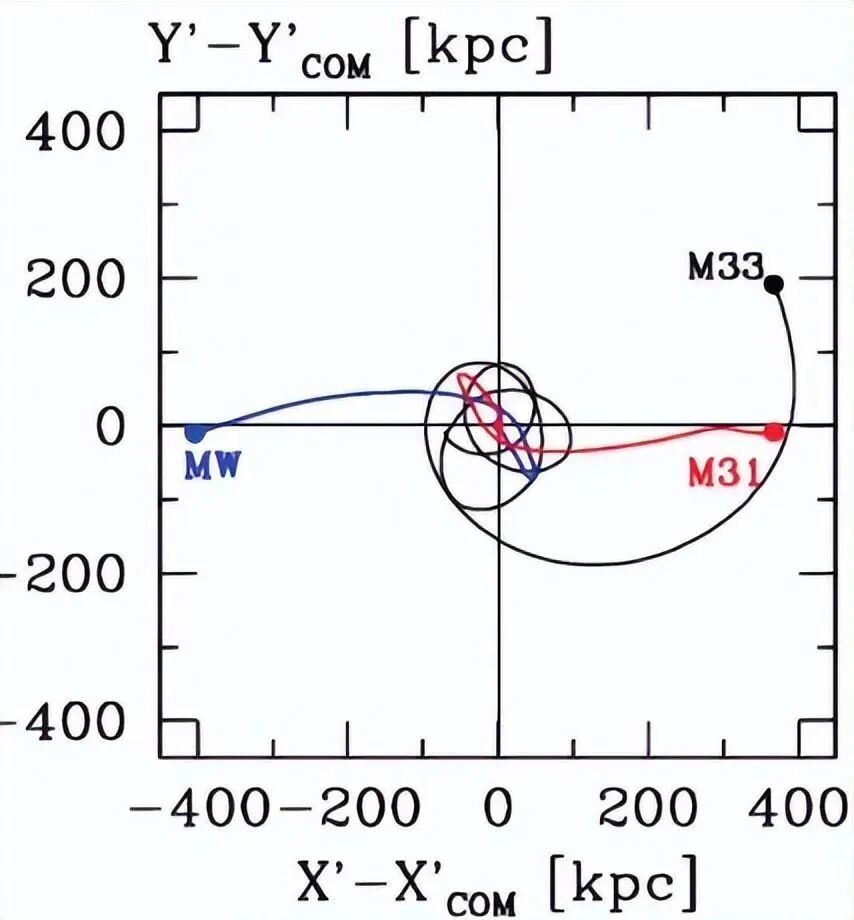 (↑“MW”代表银河系,“M31”代表仙女座星系,“M33”代表三角座星系,预计在银河系与仙女座星系合并之后,它将成为一个“卫星星系”)