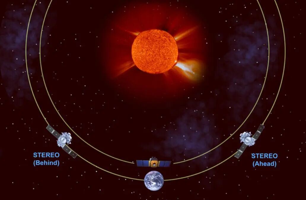 又比如说于2006年发射的“日地关系天文台”(STEREO)包含了两个太阳探测卫星,它们分别称为“STEREO-A”和“STEREO-B”,其任务是从不同的角度对太阳进行立体观测,其中“STEREO-A”运行在地球公转轨道的“前方”,而“STEREO-B”则运行在地球公转轨道的“后方”,它们也可以直接观测到我们在地球上看不到的被太阳遮挡的区域。