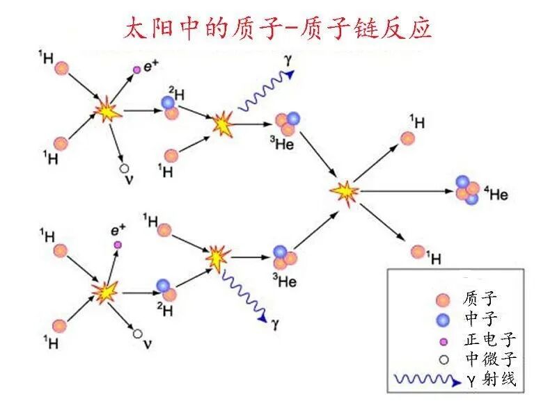 太阳的核聚变反应类型主要是“质子﹣质子链反应”,其反应过程主要分为三步:1、两个质子(也就是氢原子核)聚合在一起,并且其中一个质子衰变成中子,进而形成氘原子核;2、氘原子核与另一个质子聚合在一起,形成氦-3原子核;3、两个氦-3原子核聚合在一起,形成氦-4原子核,同时释放出两个质子。
