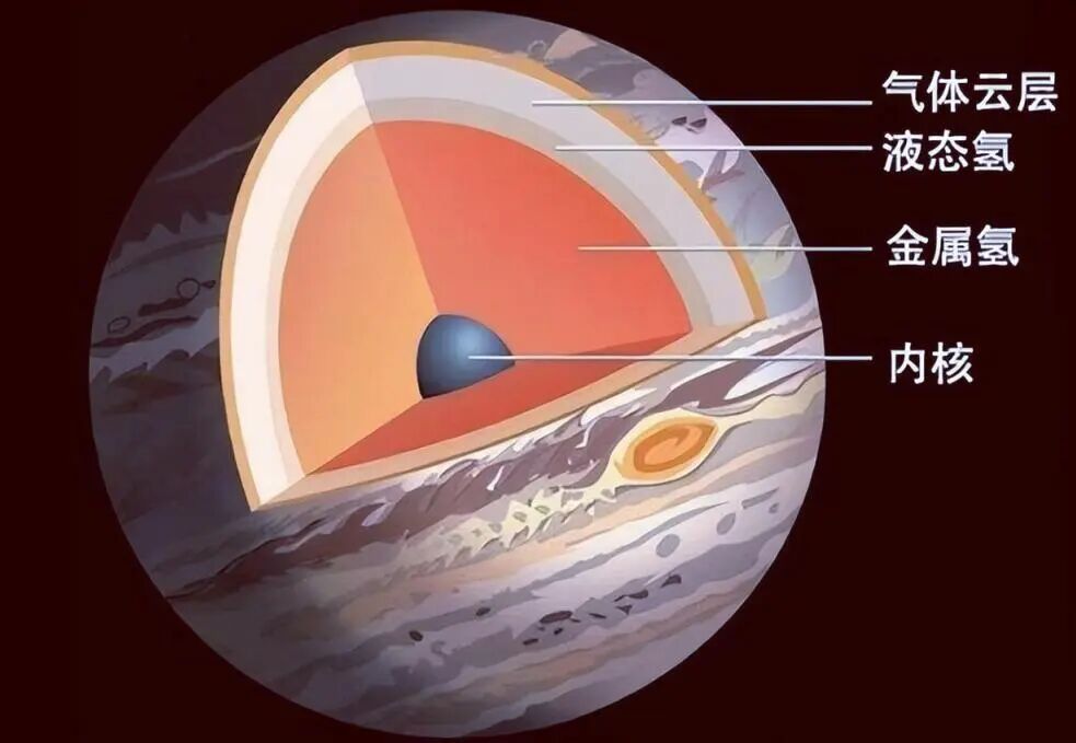 根据科学家构建的木星理论模型,木星最外层是气态的物质,下一层则主要是液态氢,再往下则是“金属氢”,最后才是木星的固态内核。