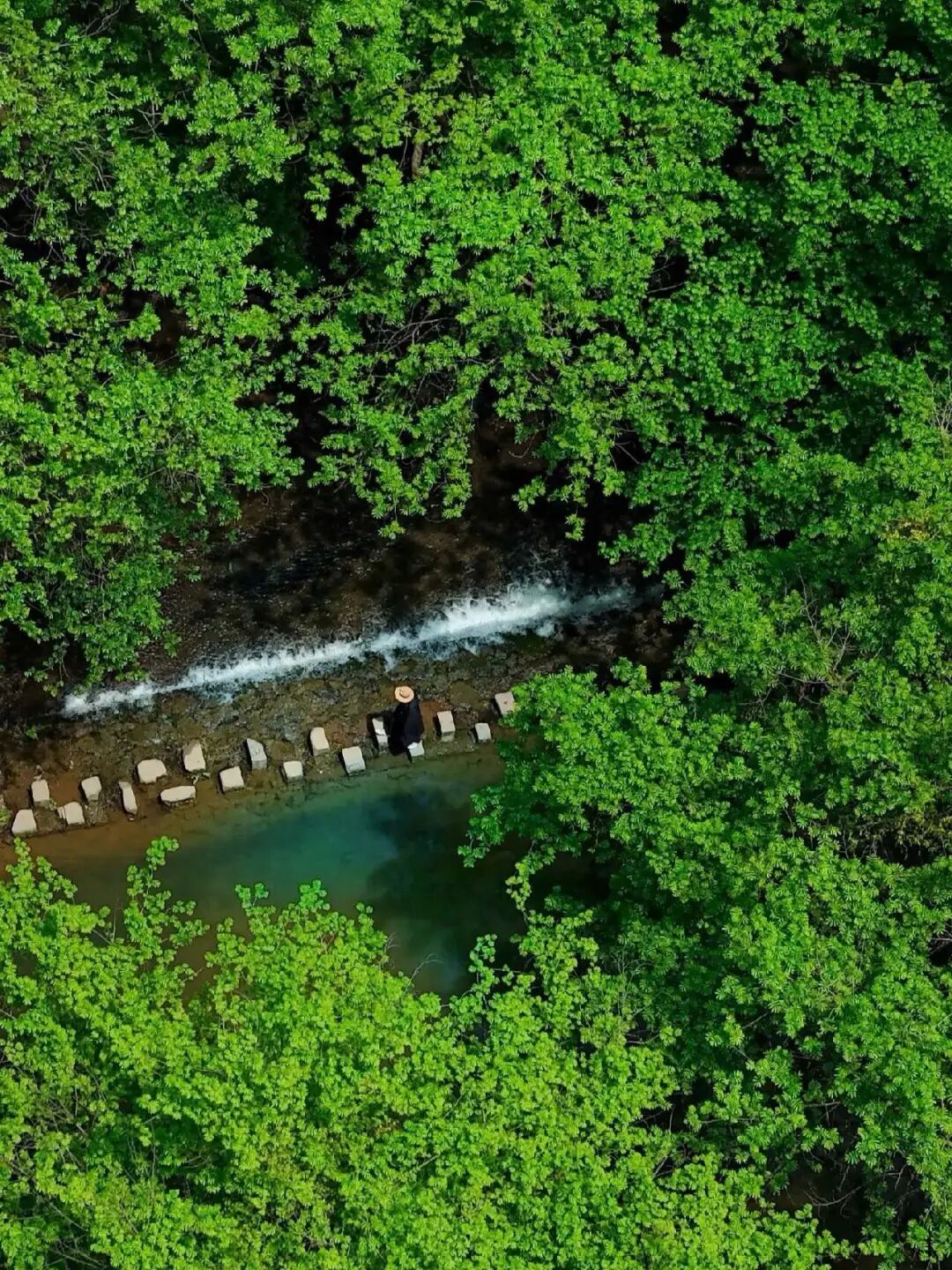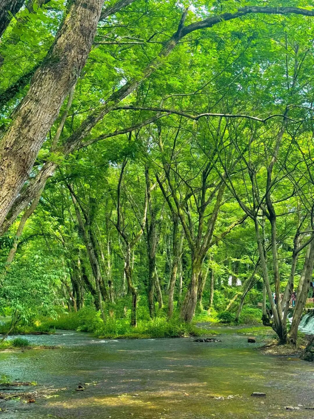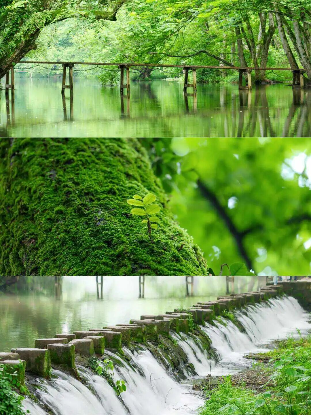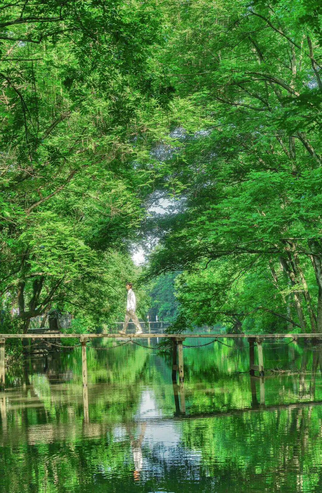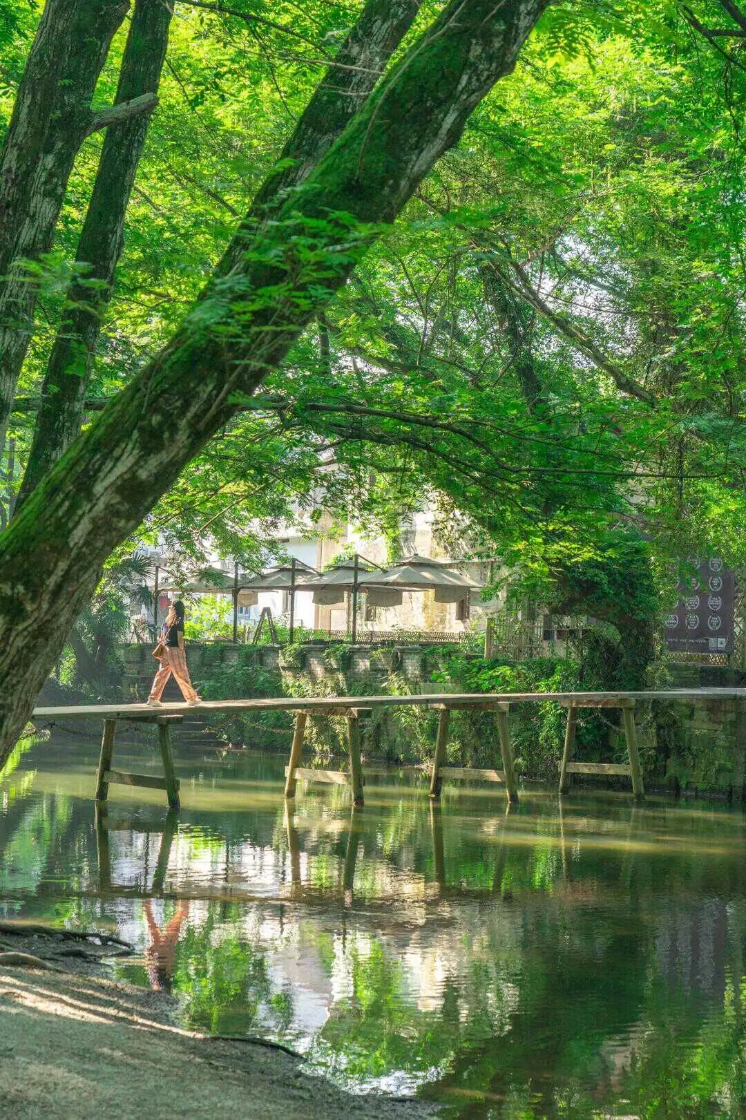 站在桥上,四周是郁郁葱葱的枫杨林,河水在脚下静静流淌,每一个角度都美得让人心动。