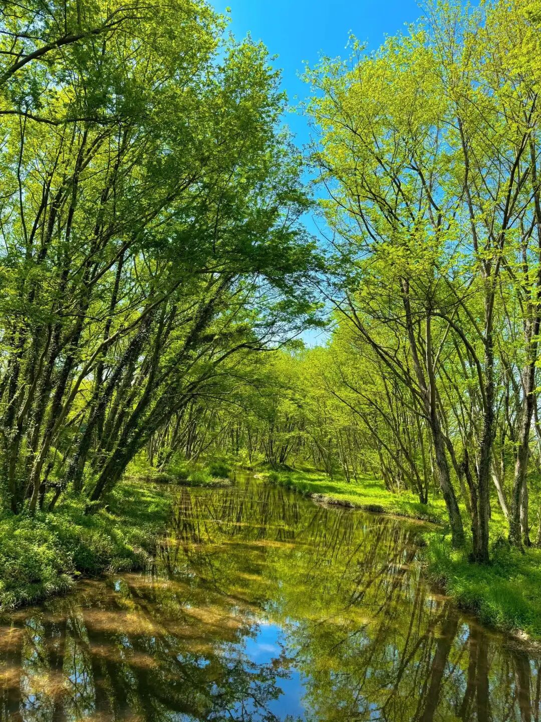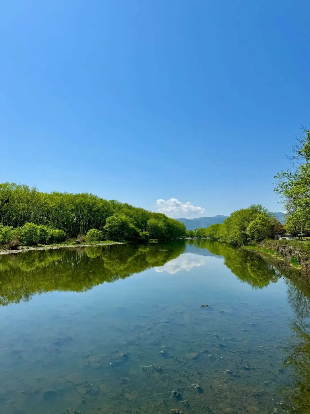 河水清澈见底,仿佛一块透明的宝石,映照着蓝天白云,映照着沿岸的枫杨林。