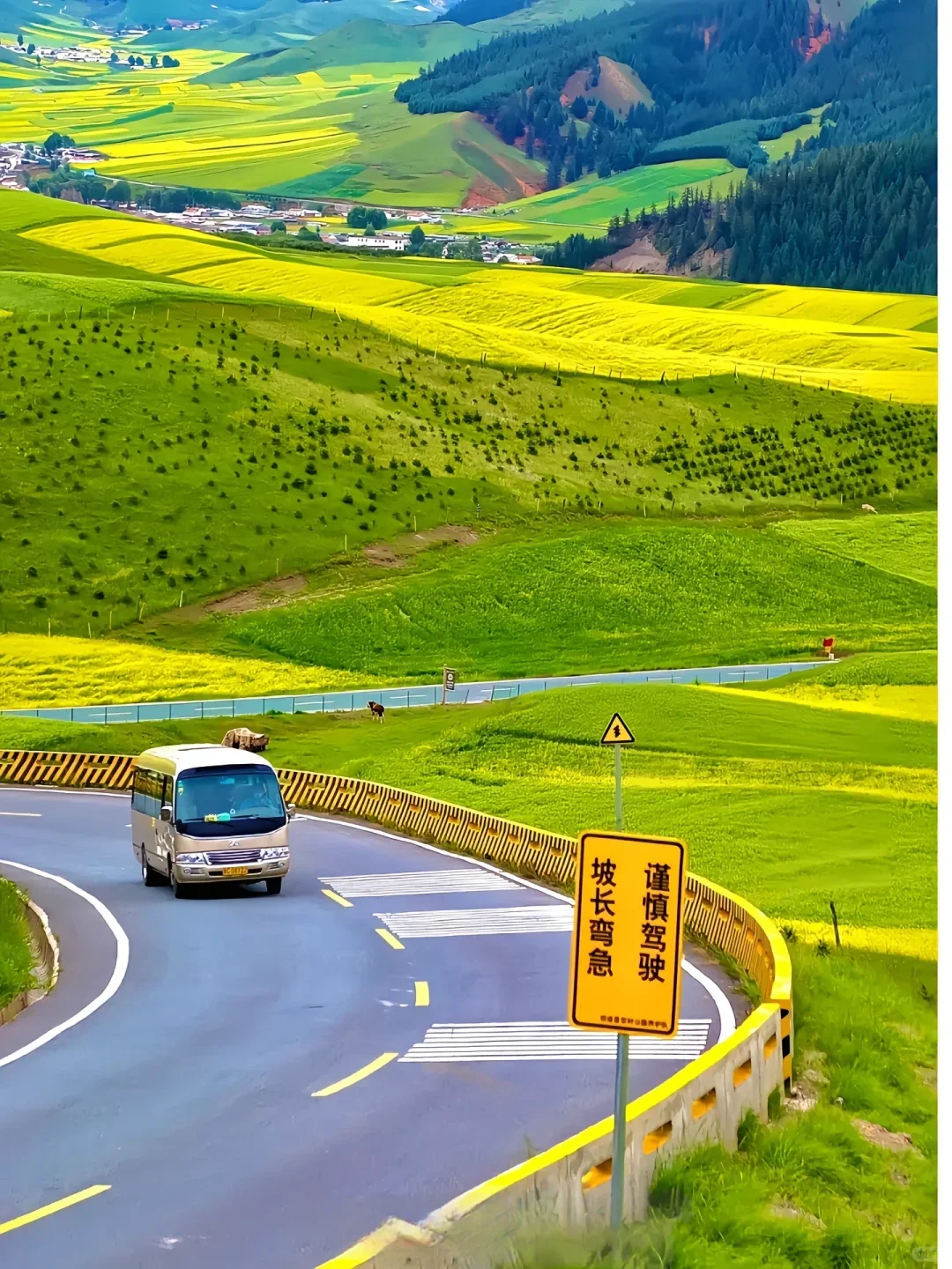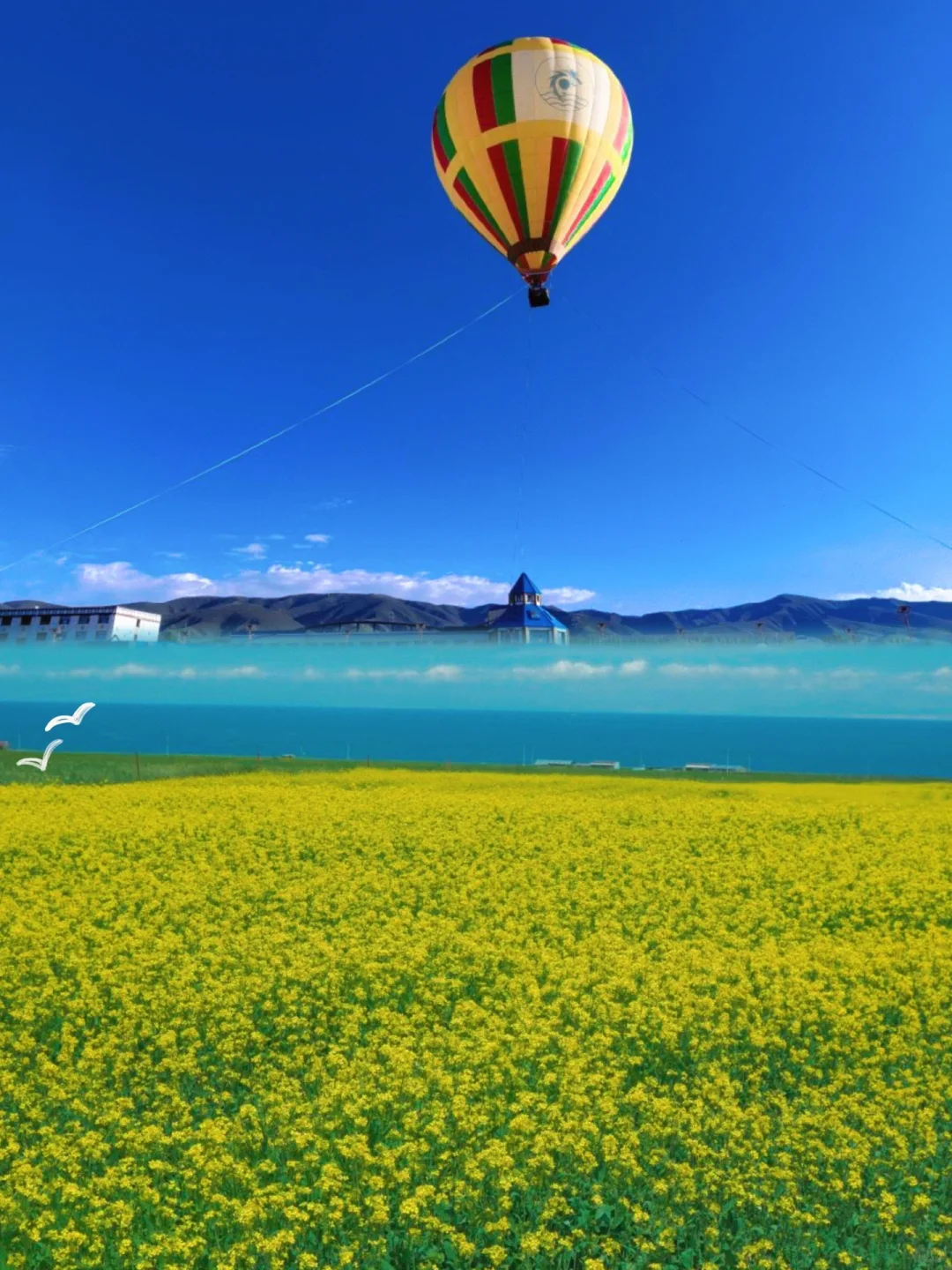 环绕湖畔,千亩油菜花田如金色的海洋,竞相绽放,高山牧场上的野花更是五彩缤纷,与碧蓝的湖水形成鲜明的对比。