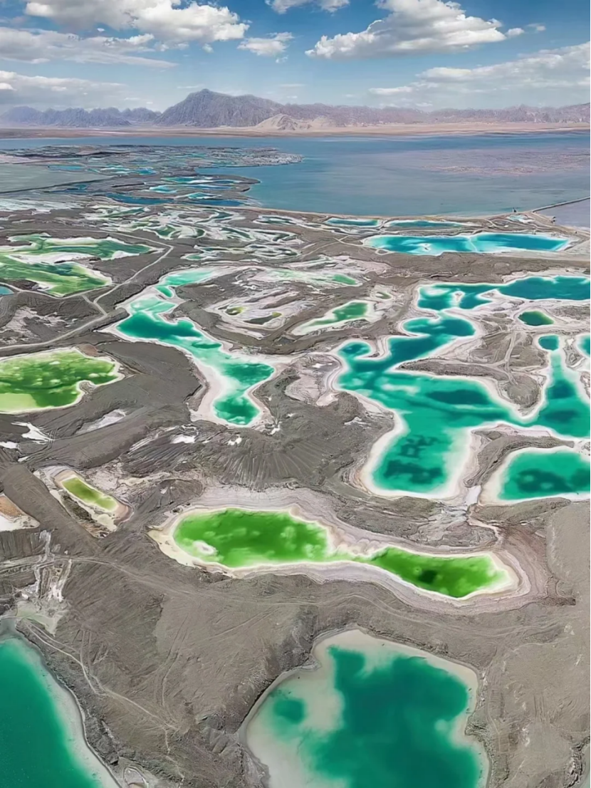 这些湖泊,大小不一,形态各异,都是多年盐湖开采后遗留的坑洞,历经时光雕
