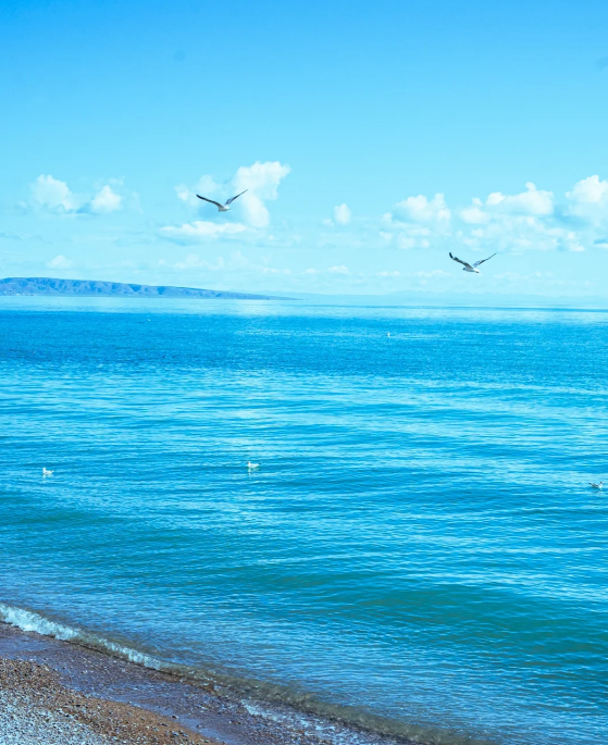 在阳光的照耀下,青海湖的湖水从深邃的黛绿渐渐过渡到浅蓝,变幻出令人叹为观止的色彩。
