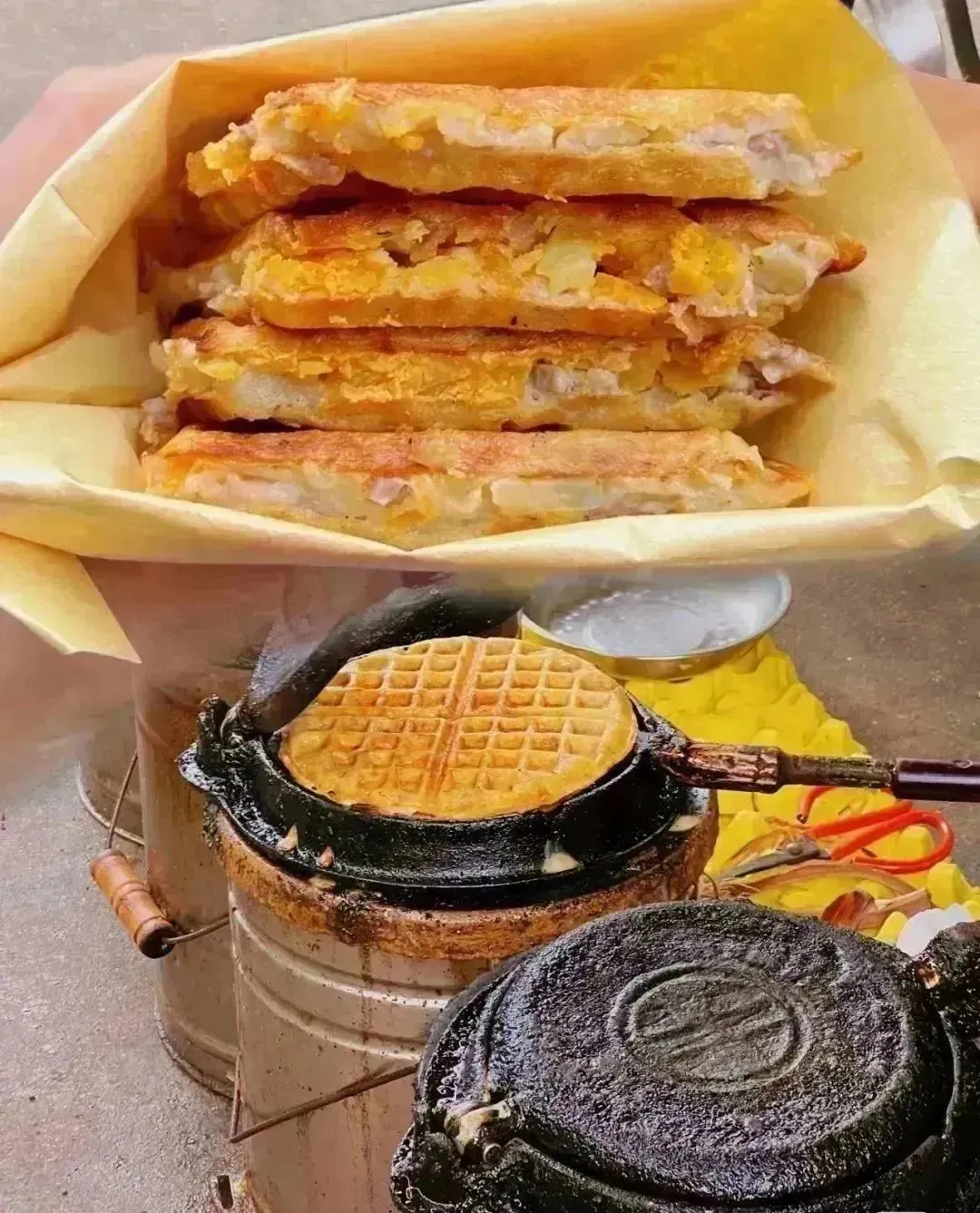 它的外皮经过炉火烤制变得金黄酥脆,内里则是软糯香甜的糯米团,分甜口和咸口,每一口咬下去都是满满的幸福感。