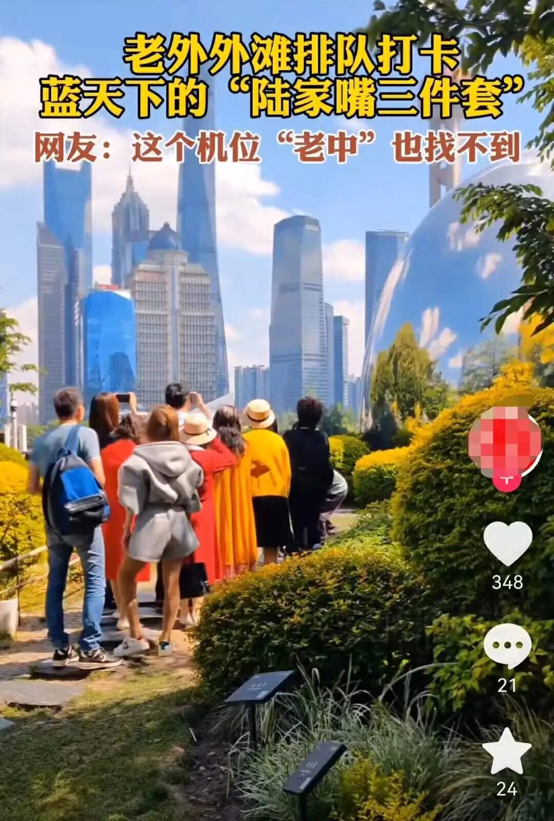 一群老外们在外滩排队打卡,从不同角度记录蓝天白云下的“陆家嘴三件套”。