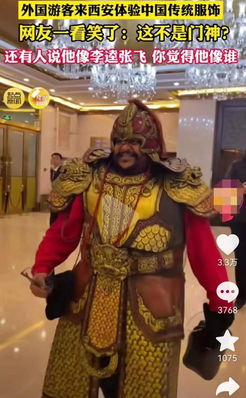 这身传统服饰,穿在这位大兄弟身上竟毫无违合感。网友都会心笑了,难不成是门神降临?