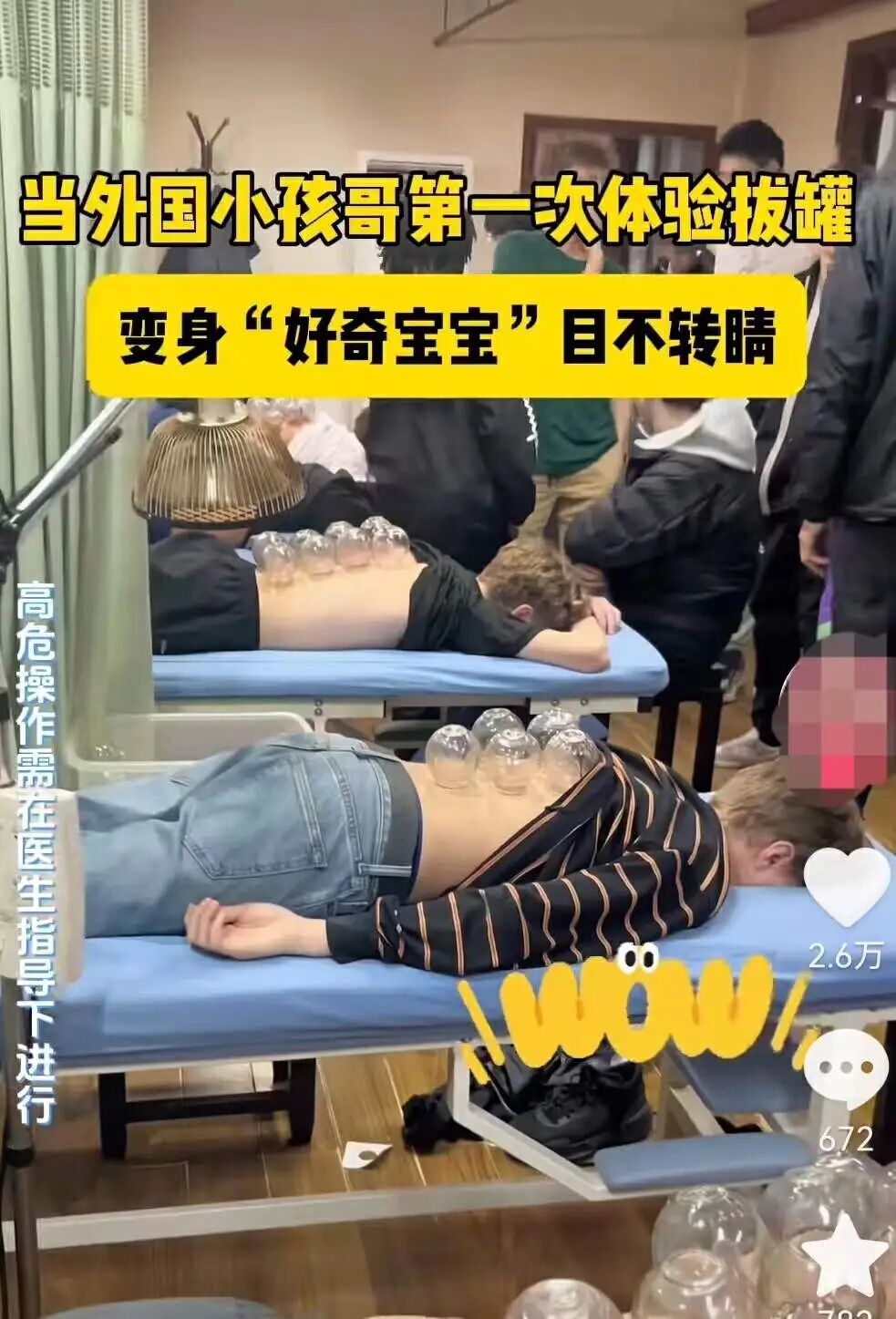 对中医慕名而来,亲自体验神奇的拔火罐,这几位外国小哥哥也是相当勇敢了。