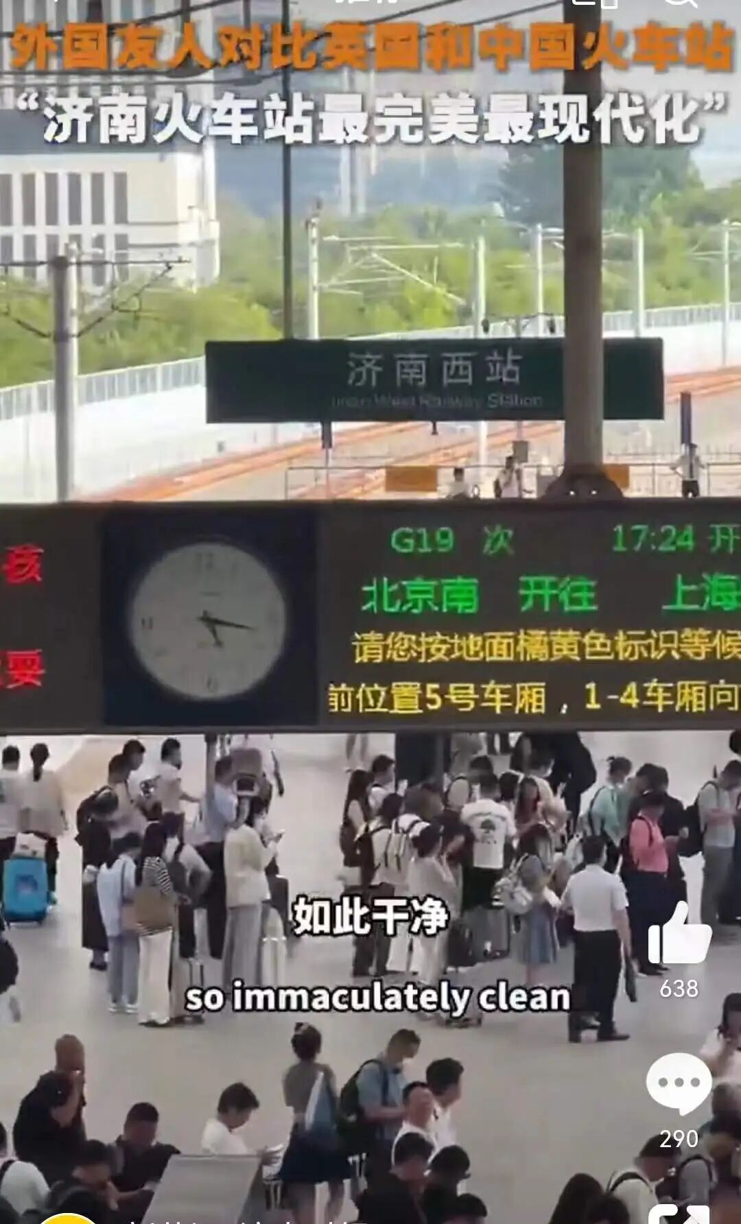 英国老外在济南西站,被火车站的美丽外观和基础服务震撼到。