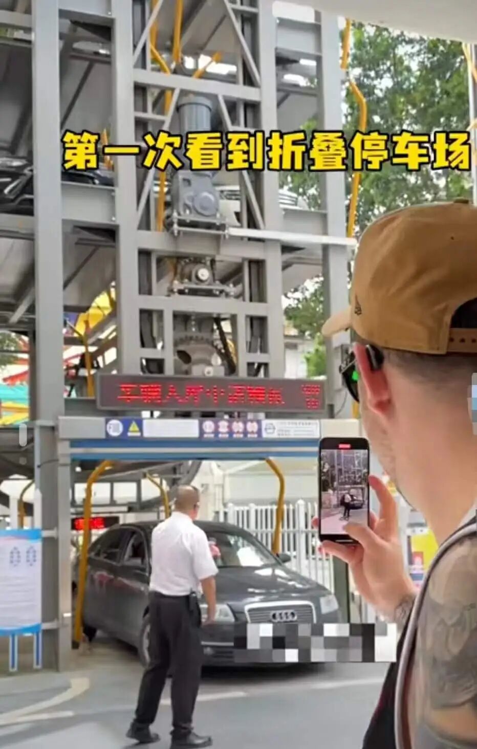 第一次看到折叠停车场,老外不自得举起手机,拍下这神奇一幕。